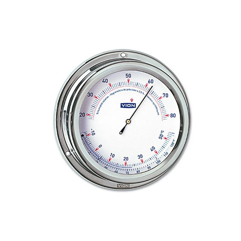 Instrument de bord indispensable en bateau VION propose le grand hygromètre + Thermomètre dans un cadran verre de 130 mm cet instrument météo est présenté dans un élégant boitier inox anti corrosion, idéal pour une utilisation en ambiance marine.