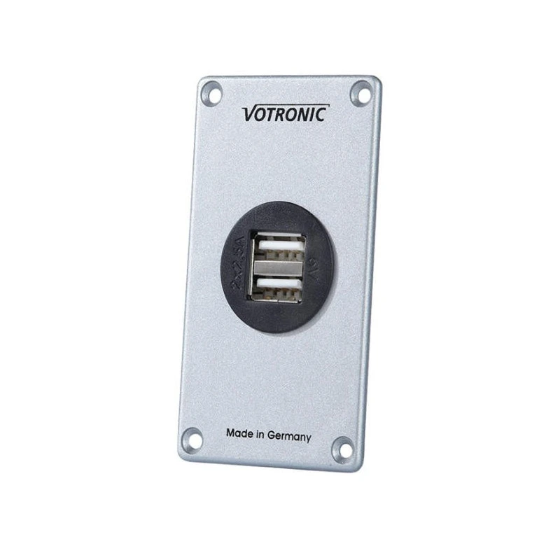 VOTRONIC spécialiste de l’électricité en bateau et fourgon aménagé propose ici un tableau électrique présentant deux prises USB en façade, puissance max 5A (2×2.5A) cette pris USB alimenté en 12V ou 24V assura une charge rapide à vos appareil fonctionnant en 5V comme le téléphone ou la tablette.