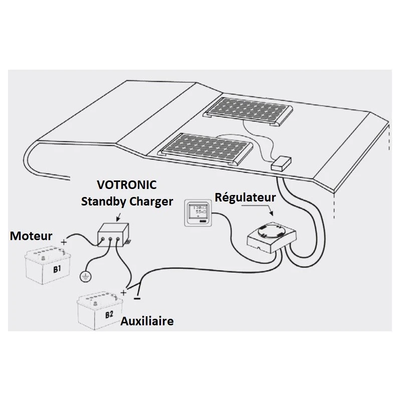 Sur bateau ou camping-car la batterie moteur ne dispose pas de la charge d’entretien du panneau solaire, en hiver ou lors de longue période sans démarrage moteur la batterie moteur s’auto décharge, avec le StandBy-Charger de VOTRONIC vous pouvez recharger ou entretenir votre batterie via votre batterie secondaire connecter au panneau solaire ou chargeur secteur.