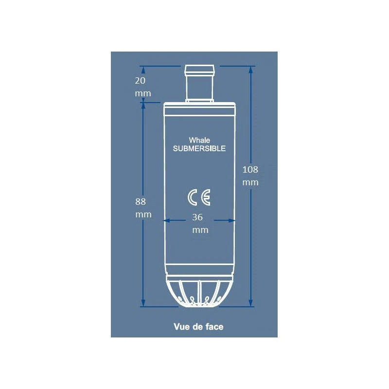 Pompe à eau immergée 24V WHALE pour l’équipement des camping-cars ou bateaux, à déclenchement par interrupteur elle se plonge directement dans le réservoir.
