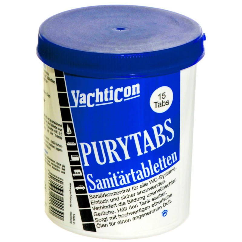 Pury Tabs de YACHTICON à insérer dans les réservoir à eaux noires (eaux de WC) des bateaux permettant de lutter efficacement contre les mauvaises odeurs.